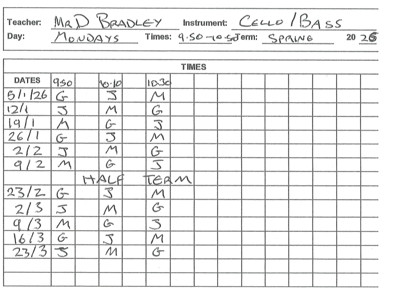 Lessons are due to commence from Monday 8th September 2025. Students will receive details of how to read the timetable during the first week of term. Please visit the music block if you have not received your details.